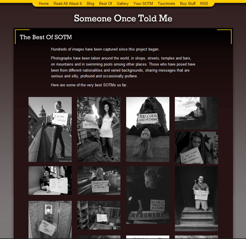 While searching the internet for inspiration for a new creative project, I stumbled across the following website: Someone Once Told Me. The website is ran by a London native, Mario Cacciottolo. In his project, Cacciottolo discusses how every person has heard some sort of advice or set of words that has shaped who they are. He decided that photographing these people and their advice would make an interesting statement. He started the project in 2007, and now posts a new image every day on his website. To read more about the blossoming of this project click here.