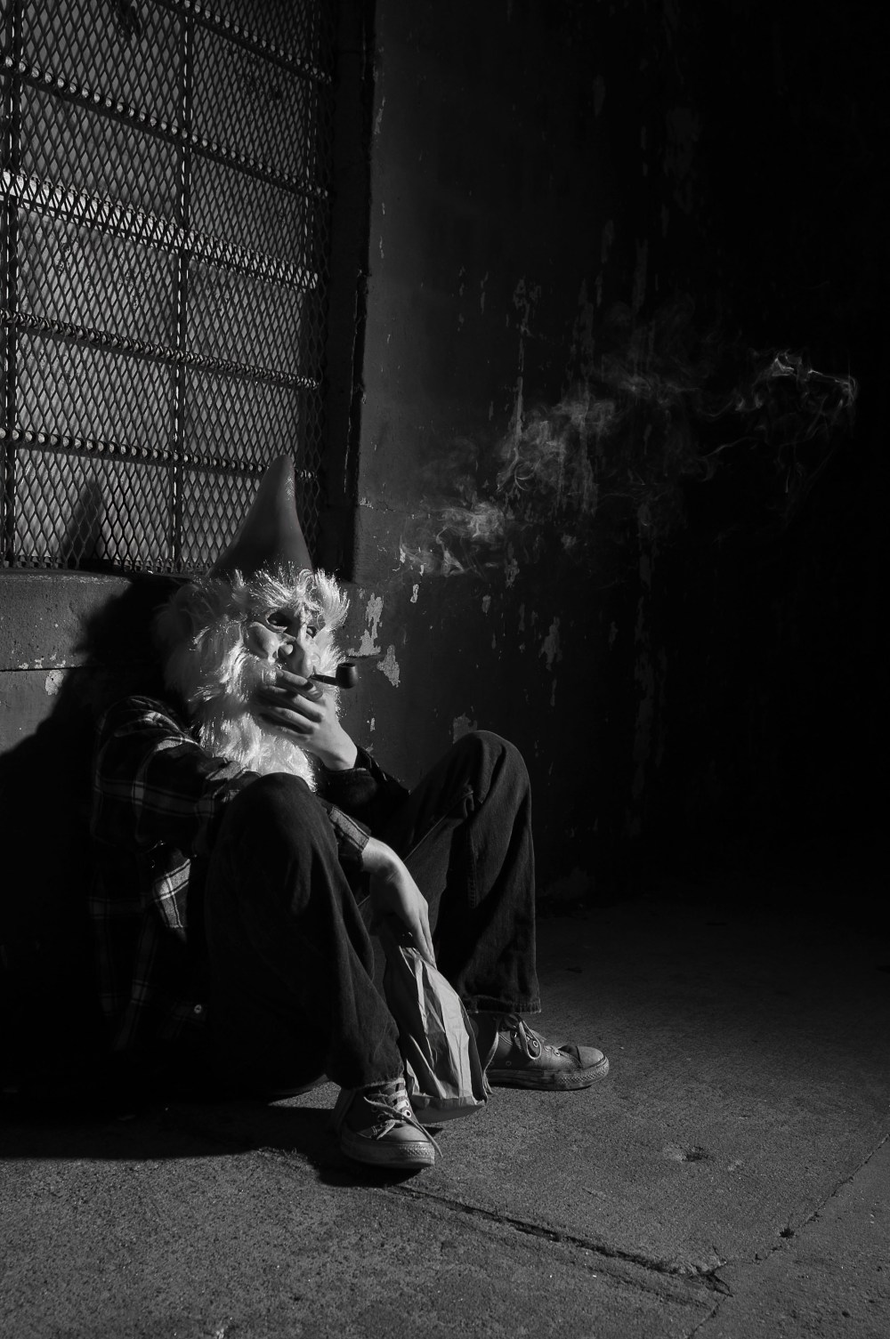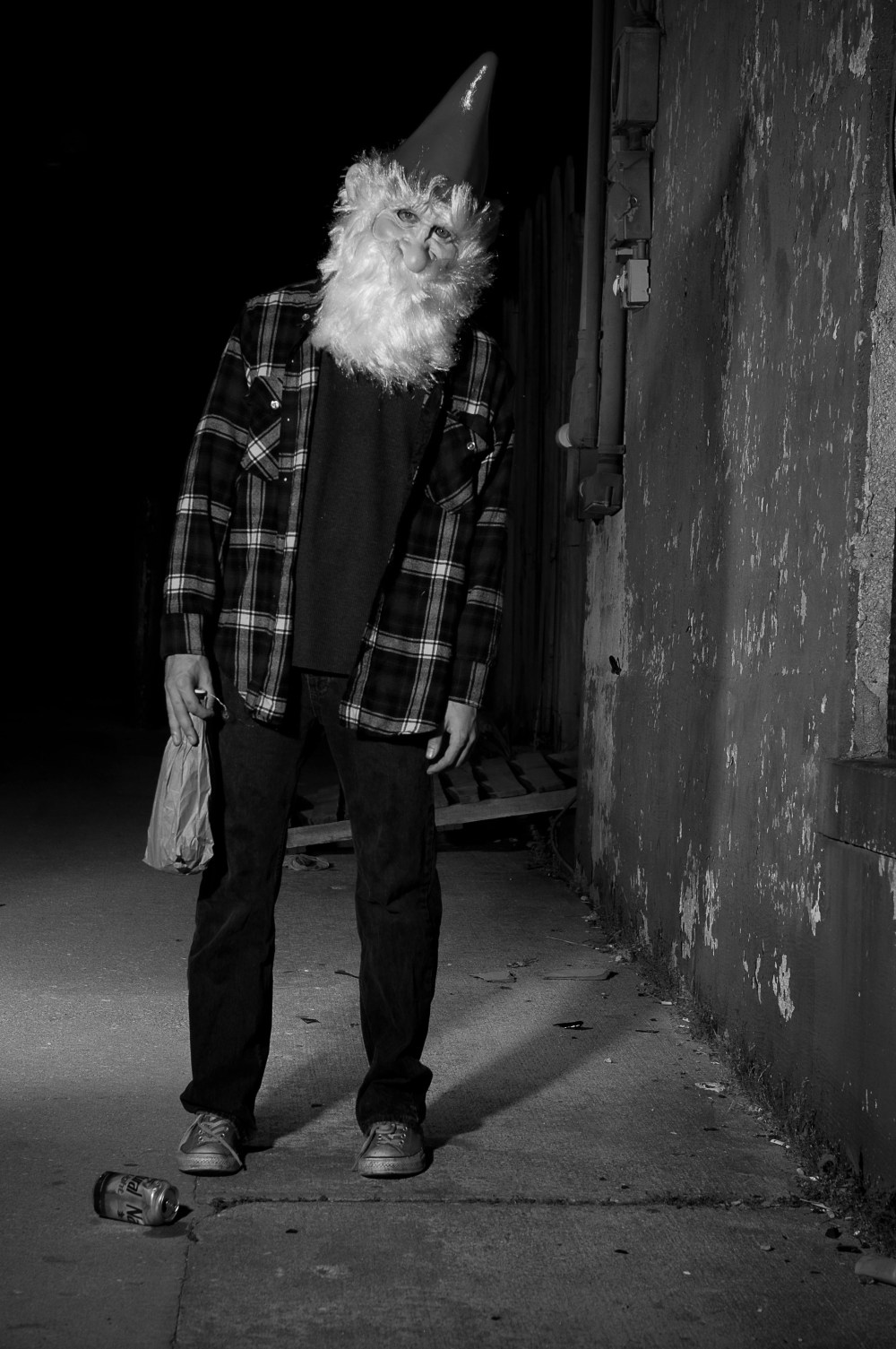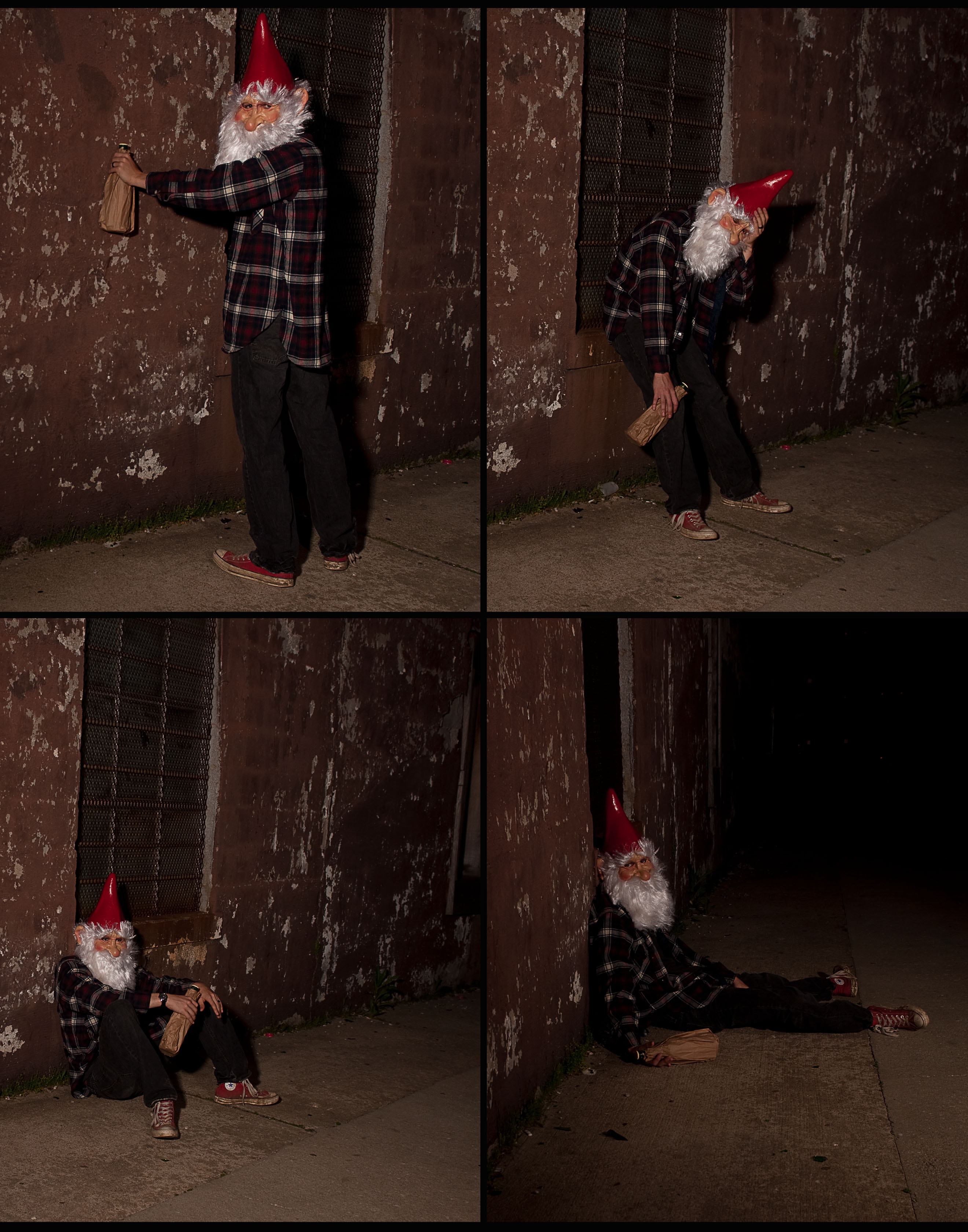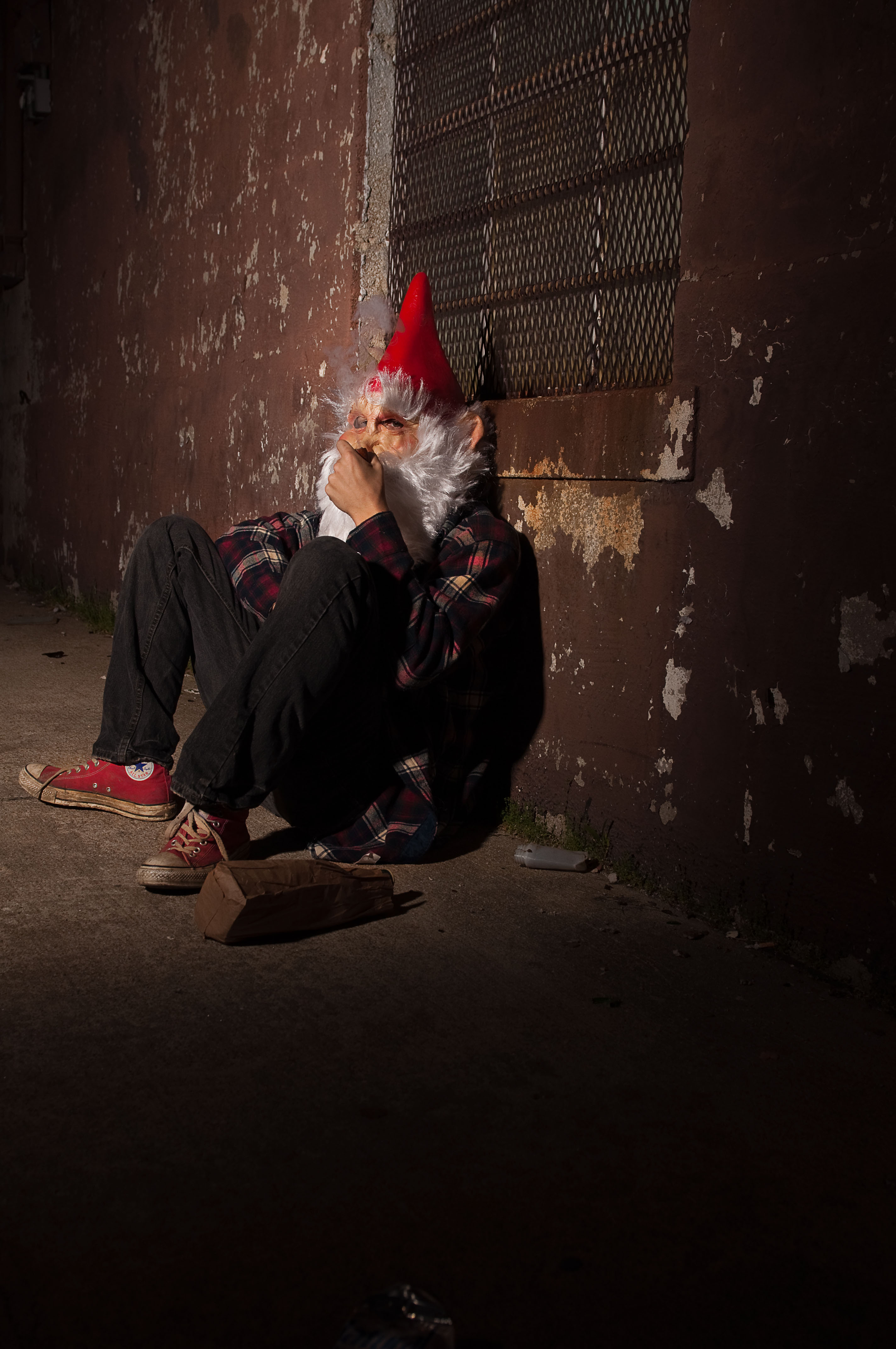 I had the opportunity to flex my creative muscles while shooting a drunk gnome series with my husband this Wednesday. We found an interesting alley behind all the pine street bars and decided to use the texture of the brick along with the broken beer bottle glass and random trash to set up a scene for a belligerent gnome to stumble around in. I used 2 alien bee’s with a grid spot to create a very harsh vignetted lighting to give an uncomfortable, gritty aesthetic. I couldn’t decide upon whether or not I liked the images as a set in black and white, or in color. I feel like a gnome’s red hat should always be present–but I think color toning is tacky. It has to be one or the other–help me decide? Anyway… enjoy them. I plan to revisit this concept as I have more ideas that I wasn’t able to execute.