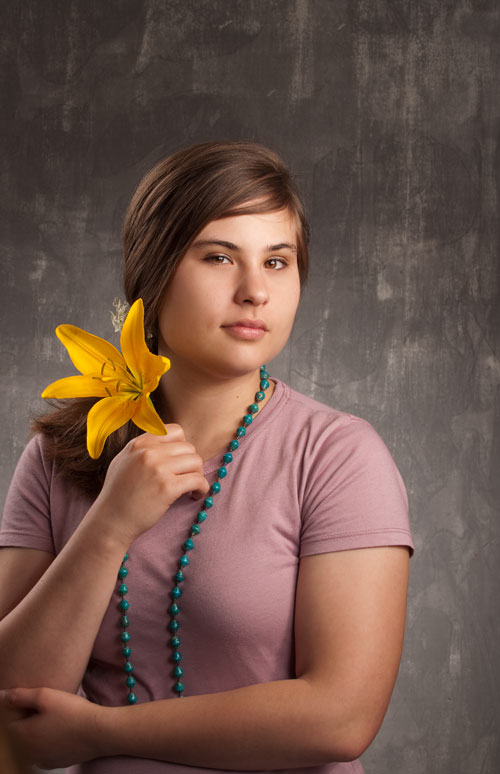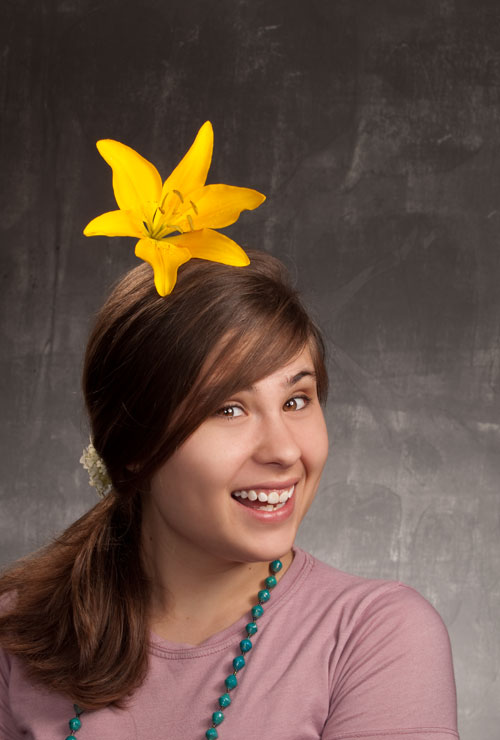 Today we worked with lighting ratios focusing on 3:1 and messing around to see the differences of light quality in the face and hair with different lighting ratios. We also learned how to put up new backgrounds and use gels with the photogenic monolights. For some reason we were a bit squirmy so we sort of got sidetracked often and goofed off. At one point we ran outside to pick flowers to use as props. Jerry wasn’t the biggest fan–but it changed things up and made for a fun day. Jerry and his wife bought us tacos too for lunch! yummy!! Tomorrow we are going to learn high key and we will have a different model other than ourselves! I’m pretty excited. Anyways…here are some images from today’s shoot.