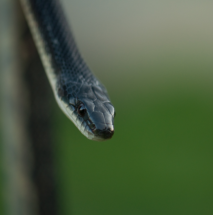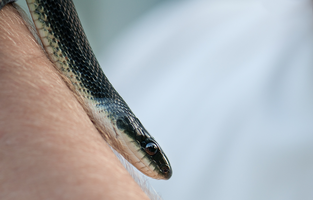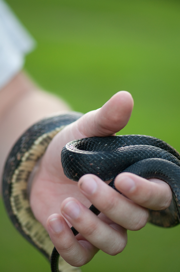 My lovely neighbor and even lovelier friend Tara Schlotzhauer, came a knocking at my backdoor late this evening. Her boyfriend and avid snake lover Casey Blystone had captured a wild rat snake at Pertile Springs here in Warrensburg and they were about to release it. She thought it was a good photographic opportunity and invited me to take part in the release. I got some really interesting images. For a wild snake this little one posed well and behaved almost as if it was natural for a human to be handling it. Casey and Tara both seemed impressed… in fact I think Casey now has an inkling to get a rat snake of his own. š