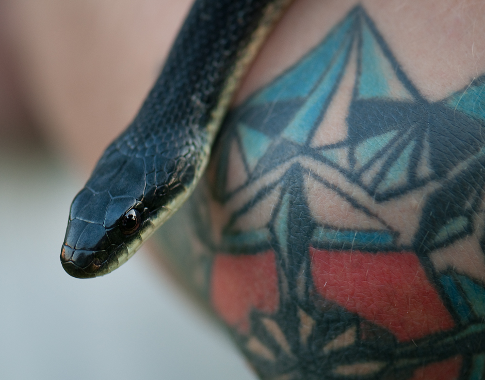 My favorite is the photo of the rat snake lying against the human arm. It has a lot of symbolic messages. The crisp detail of the arm hairs and snake scales brought out a nice theme of the contrast between reptile and mammal. The juxtaposition of snake and human male limb subliminally illustrated the Jungian association of snakes with the human penis.