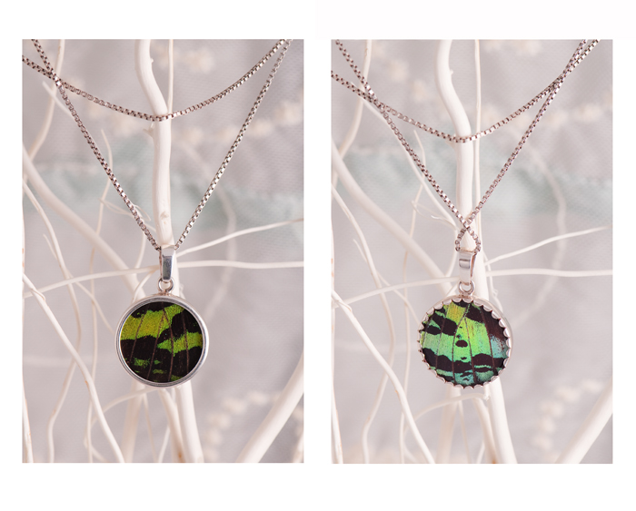 Our butterflies are collected after dying naturally at the end of their full life cycle in the Equatorial Rainforest. The delicate butterfly wings are skillfully prepared and set in Sterling Silver. This environmentally sensitive program provides income for local families while encouraging conservation and a sustainable lifestyle. Shimmerwings are durable and the colors will remain vibrant, however please avoid exposure to water.