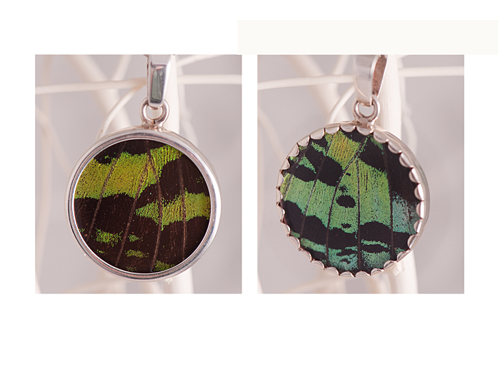 While we were there we were enticed by some pieces called Shimmerwings, which were pendants and earrings made from tropical butterflies and moth wings encased in a sterling silver setting. I made sure to take an informational card and here is what is reads: