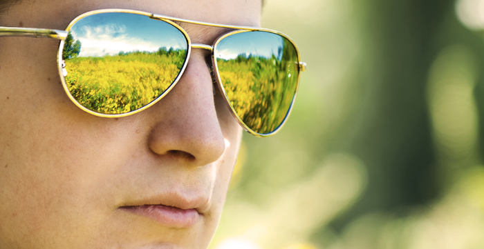 This next image was just a fun experiment that I did. Chet and I took Monty to his favorite park to play and I found a field of yellow flowers. Chet was wearing his mirrored aviator sunglasses and I thought it would make a neat image to photograph the reflection of the field in his glasses. There is also some bokeh in this image!