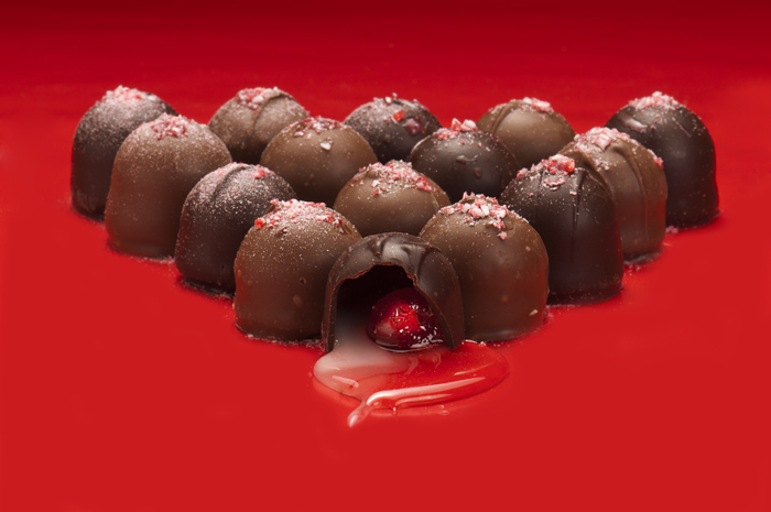 Oohh! Here is a quick image from the shoot I did in the studio with chocolate. I used dark and milk chocolate cordial cherries and sprinkled some peppermint flakes on the tops. Tricky stuff to photograph!