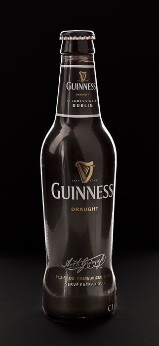Good start. Consider double diffusing the side lights. Also, turn the bottle so the word Guinness is centered on the bottle.