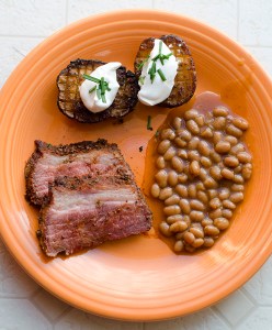 I came home to find my wonderful husband tending the grill. He had surprised me by starting on a delicious beef brisket with his special homemade rub. He was slow-cooking it with mesquite wood chips and a spray of apple juice every 15 mins. Needless to say, it was labor intensive but totally worth it. He also had my favorite cross cross potatoes cooking away and some delicious baked beans. Here’s a quick shot of my tasty birthday dinner!