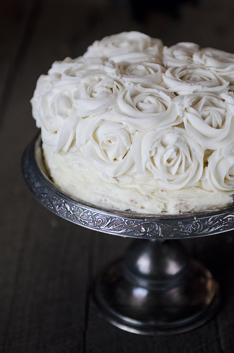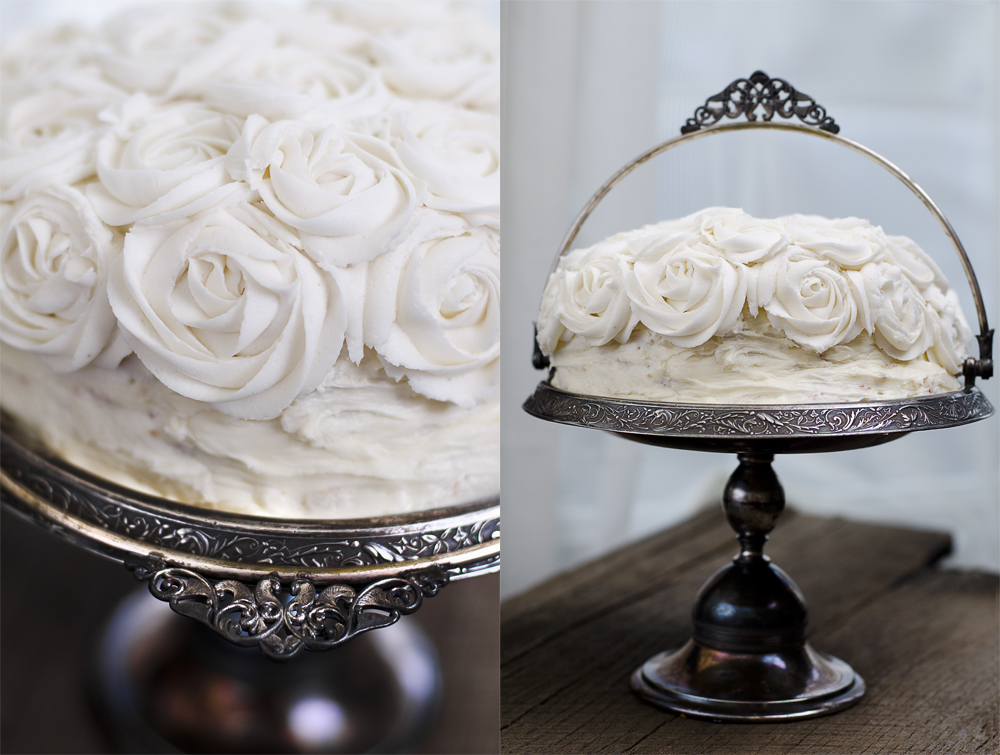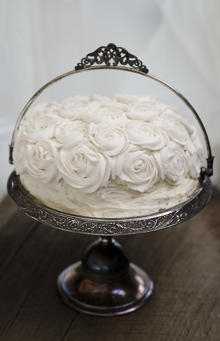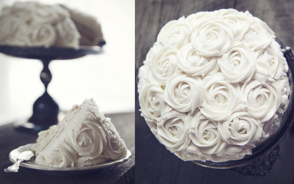 I saw a method of creating roses with frosting a while back on one of my favorite food blogs. I decided it was something I had to try and I finally got the chance to this weekend. I used my husband’s grandmother Hoo Hoo’s decorator frosting recipe as she was once a professional cake decorator! I made this cake thinking of her and all the beautiful cakes she made for people in her lifetime. The cake is a 3 layer angel food cake with a simple white frosting. The frosting on the cake is different from the decorating frosting. It took me from start to finish about 4 hours to make this cake. I decorated the cake with roses and messed up badly on the last couple, so I had to scrape off all the roses I had already piped and start all over again. It is my first attempt at this technique, and I know that there is room for improvement, but if I don’t say so myself, it was a pretty decent attempt!  I wanted this to be a very simple photoshoot, without a ton of props to distract from the elegance of this cake. Hope you enjoy!