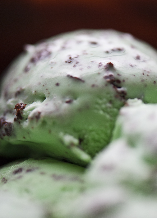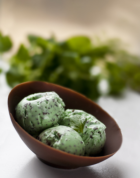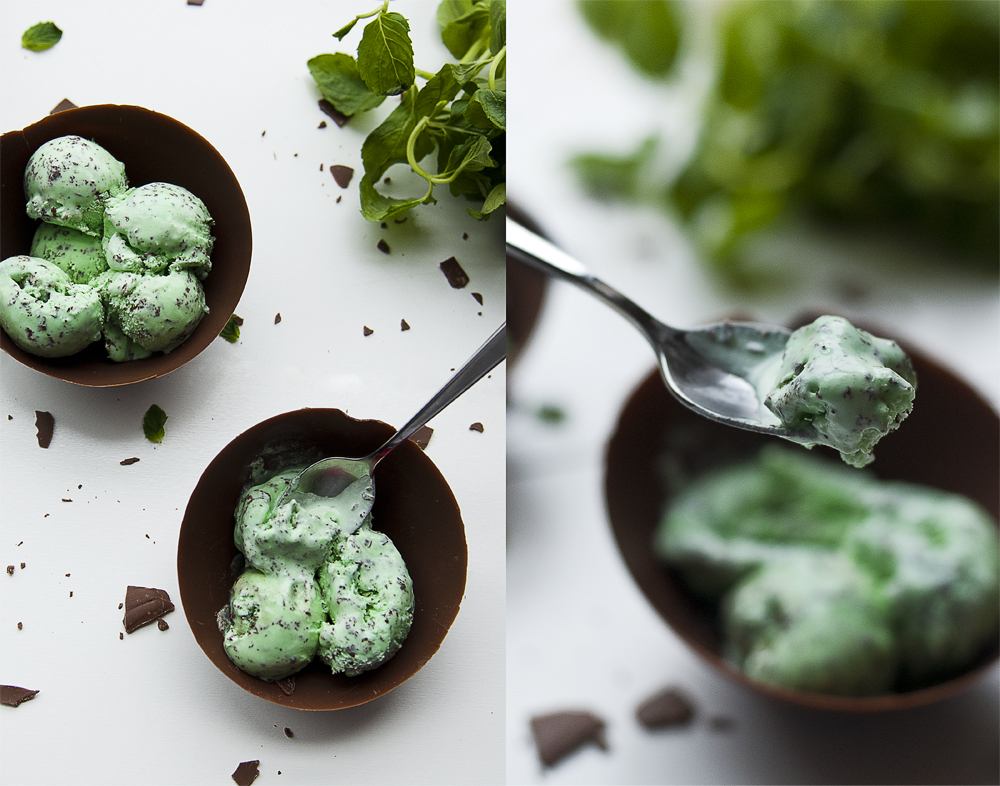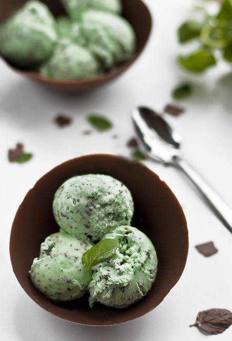 I have been wanting to photograph ice cream for a very long time, but I could never decide exactly how I wanted to present it visually. I stumbled across a food blog which had a tutorial on creating homemade chocolate bowls/shells. As soon as I saw it my mind instantly flashed to a bunch of scoops of mint chocolate chip ice cream served in a big chocolate shell with mint leaves and shavings of chocolate as accents. I just now had the opportunity to bring this vision to life.