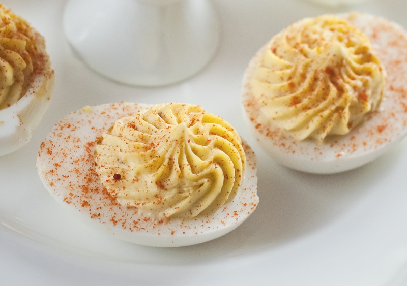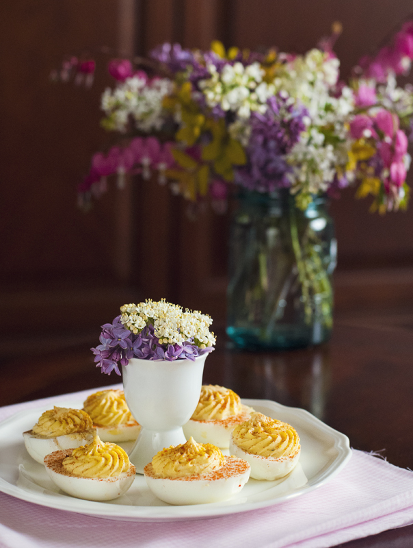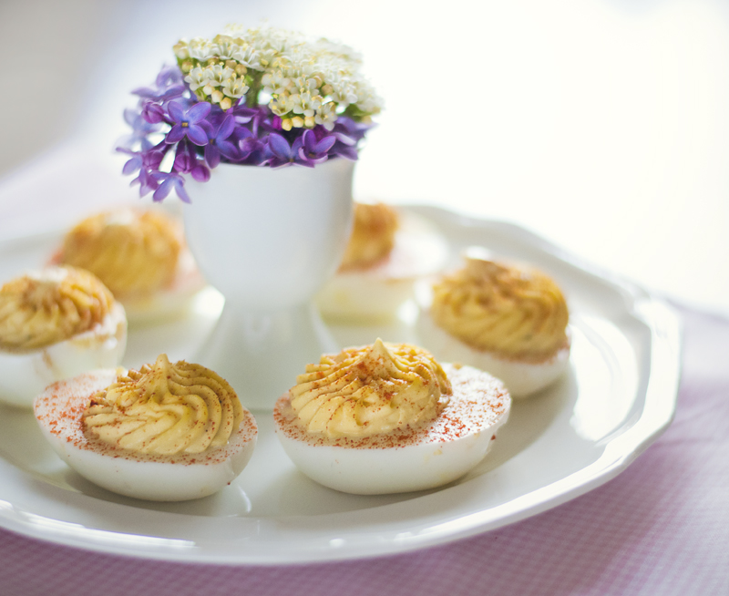 Writing this in the first wee hours of Easter Sunday! I had a huge celebration with my family last night and I had so much fun. My family is filled with wonderful people and every time we get together to celebrate I come home so happy to have them in my life. We had roughly 15 people at my grandparent’s house. We served a 19.5lb ham, which almost carved itself because it was so moist and tender. My grandpa makes THE best mashed potatoes and my personal favorite–HAM GRAVY. If you’ve never had it, you are missing out BIG time. I contributed 60 deviled eggs which at first I thought was going to be too many but after the crowd cleared I only had maybe 20 or so left over. Which, between my husband and I will go quickly. 🙂  We also had wonderful organic vegetable and fruit salads. For dessert, 3 lemon meringue pies. All in all, I say we feasted like kings. I hope you all are able to spend some time with family now and then. It is important to remember the amazing people you have in your life and spend good quality time with them!  You all know that I can’t resist making food and not photographing it. So here are some images of the eggs I made! I even made a quick spring bouquet to emphasize the Easter colors!  Enjoy!