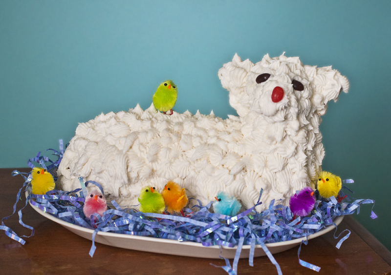 Today I had Easter dinner with my husband’s family! We had another round of delicious ham and potatoes! We also had a tasty seven layer salad and warm rolls! In addition to the tasty meal, my mother-in-law made a pound cake “lamb” cake.  Her mother would make one each year and we decided it would be fun to carry on the tradition and make one this year! We piped the frosting onto the cake to make it appear as though it was fur. Then we used jelly beans to make the eyes and mouth.  I thought it would be cute to add in some little Easter chicks as friends of our little lammy.