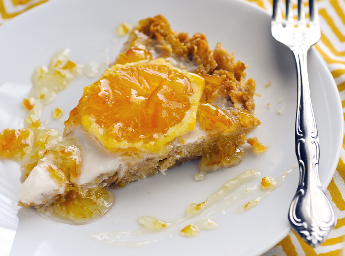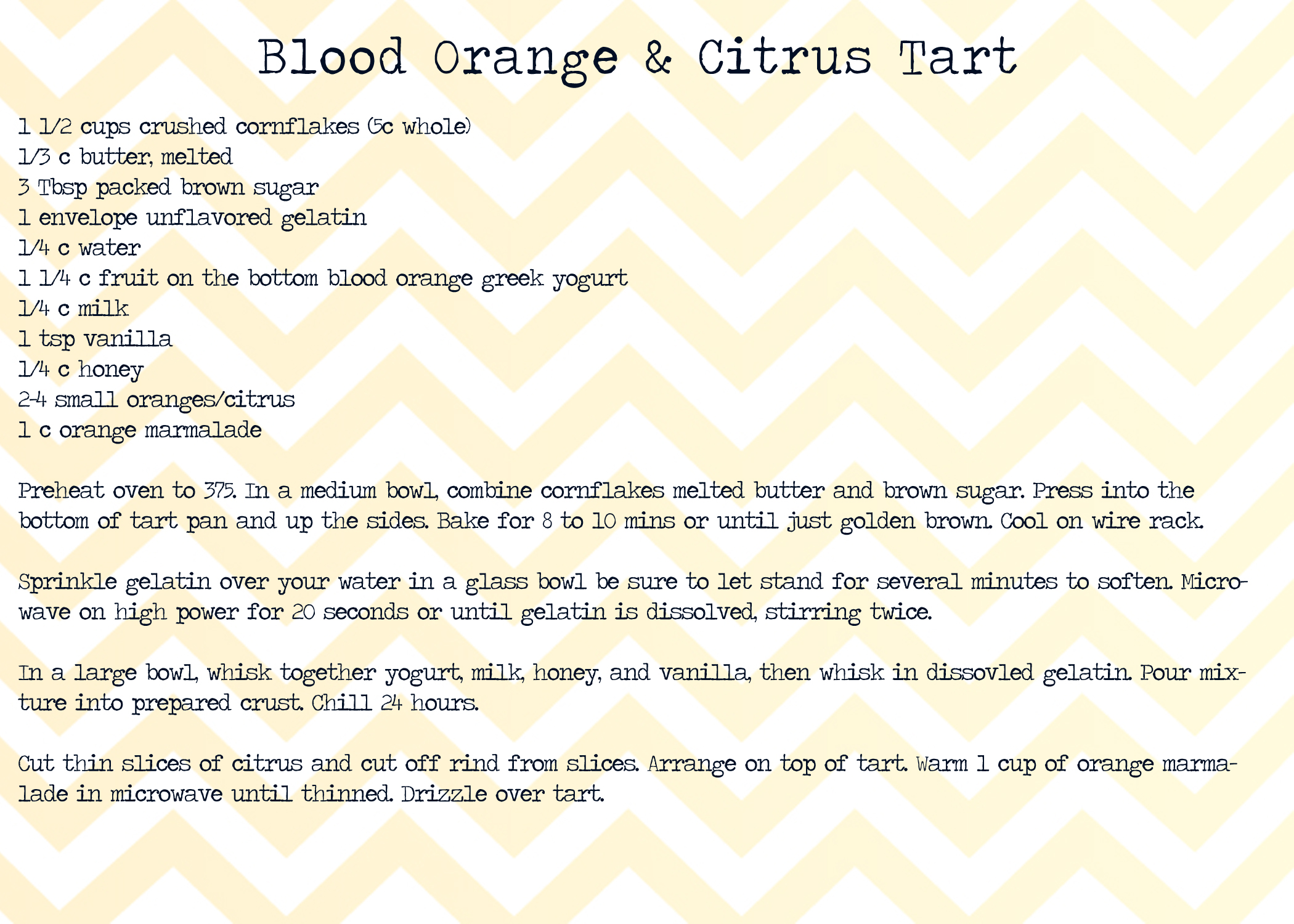 Anyways, I ran to the store to get ingredients, fully intending to follow the recipe to a T. As I was hemming and hawing about which of the several brands of Greek yogurt I should use, I spotted a small container of blood orange Greek yogurt. I love blood orange and decided to use that rather than plain for an extra pop of flavor. This tart is so good I’m going to include the recipe for you all to try. Which you should do, because if you don’t your life is missing something incredible. The crust is made from crushed cornflakes mixed with melted butter and honey. Soo delicious, I could eat the crust alone! To finish, thinly slice various citrus for garnish (I used oranges and grapefruit) and warm up some orange marmalade to drizzle on top.