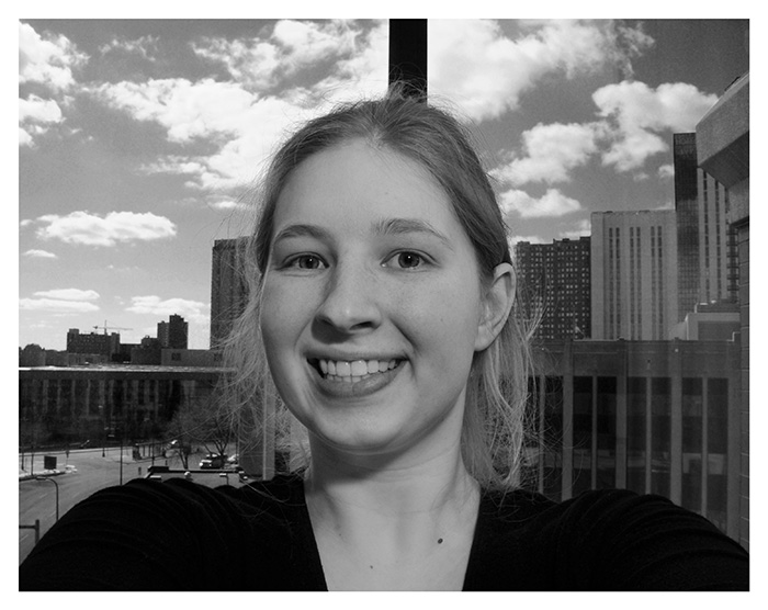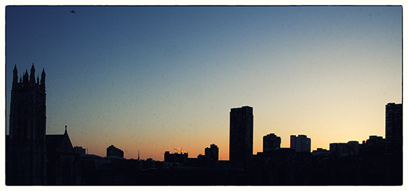 Thank you for the happy black & white self portrait! I like the sky line with the tiny plane! Broad, bold, sunset clouds, glowing church tower, & reflecting base are glimpsed in the strange light before sunset cast on buildings that make people what to hurry outside to see where they are. I enjoyed the angled, & rounded lines of buildings above neatly planted, slightly wild trees in another photo. Sunset coloring shapes buildings. You brought moon lit clouds to the city scape, drawing separateness together. The bridge draws to a city within an infinite sky. Walk past the starry street lights, look up, buildings block sky, but from here you see it all! Wonderful color self portrait seen before the real wild child on the bridge!