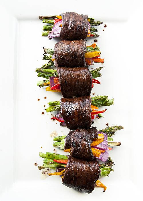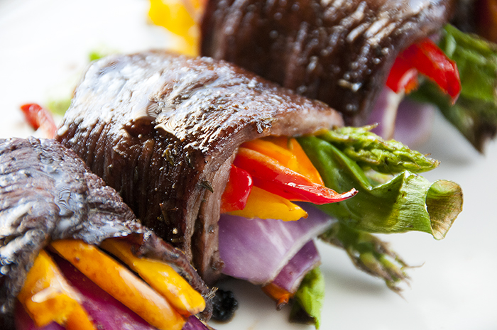 After your meat has marinated lay out the individual steaks. My flat irons were quite wide, so I cut them in half to make them more manageable. Next, place your veggies in the center of the steak. Take one end of the steak (doesn’t matter which one, I started with the right because I am right handed) and roll it over the veggies, making sure to tuck the end of the steak aggressively around the veggies. Continue to roll until the steak has fully wrapped around all veggies and overlaps itself. Secure the veggies and steak in place with bamboo skewers.