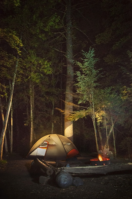 Once I was satisfied with my photos we went back to the campsite. We didn’t arrive until close to 8pm. By that time I had walked a grand total of 13.5 miles that day. My legs were well aware of this fact. Chet and I struggled to keep our energy long enough to do another dusk river wade. We made a loaded baked potato soup and I was hungry enough to make myself some hebrew national hot dogs. We reminisced on our day and adventures by the campfire. I had hoped that the weather during our trip would lend itself nicely to do some milky way and star trail photos. Alas, each night the clouds rolled in and spots of rain trickled down our tent. I only did one night shot, which was a photo of our camp site lit up by the fire and our tent lantern. I thought it turned out pretty neat.
